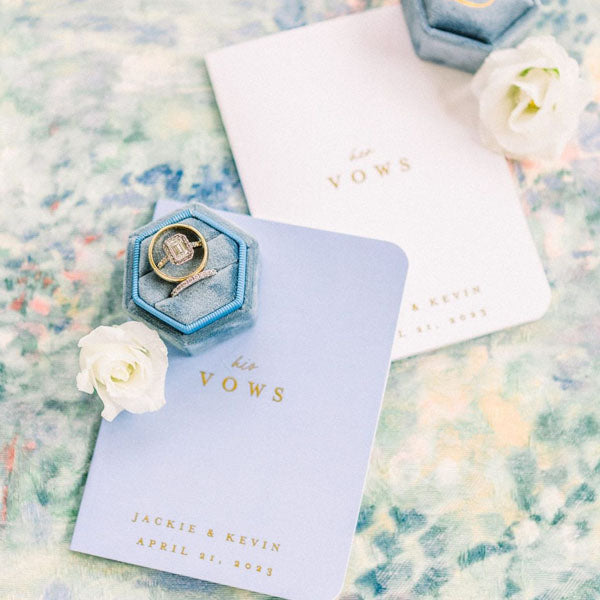 Each vow book measures 5.5 x 4 inches, making it compact and easy to hold during the ceremony, while also small enough to conveniently fit in a pocket.